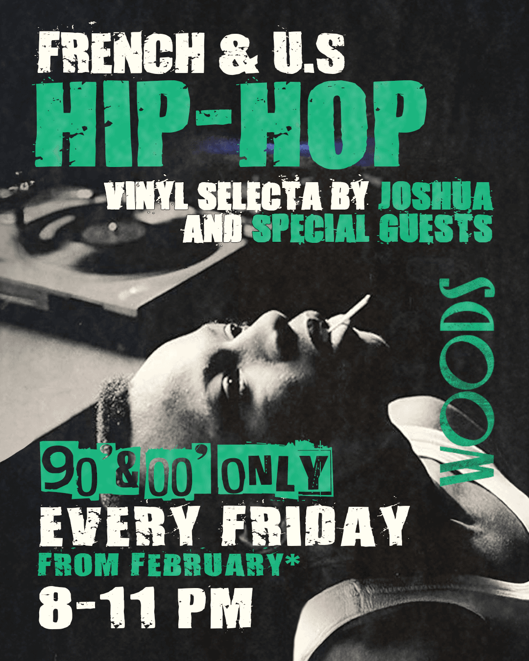 Your favourite Friday ritual: enjoy the warmth of ’90s and ’00s hip-hop on vinyl, every Friday at Woods. Joshua takes to the decks with a curated selection of French and American tracks from hip-hop’s golden decades.